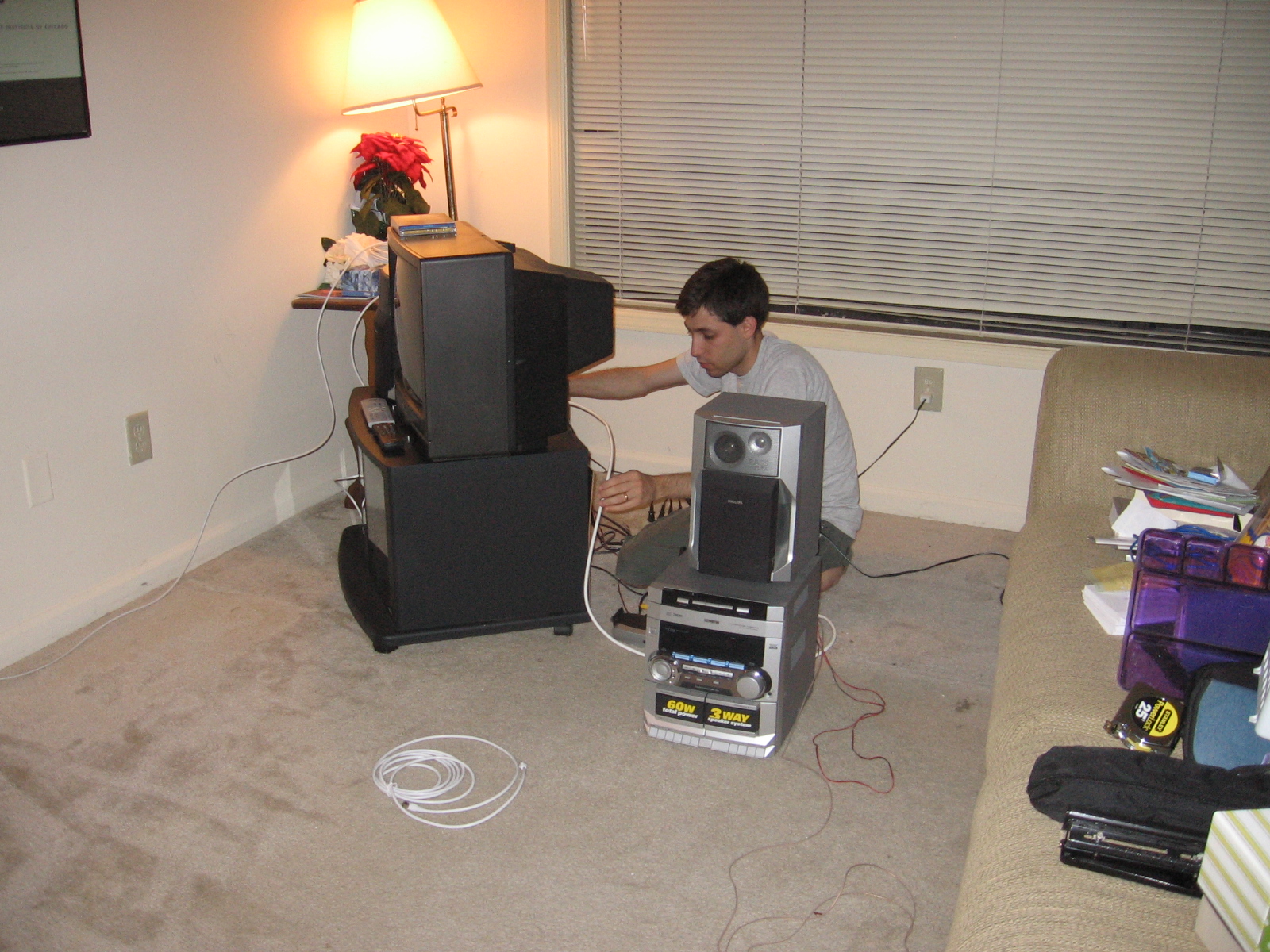 Rearranging the furniture: Paul trying to hook the TV back up after we moved it. He didn’t like my method of just throwing the wires behind the TV.